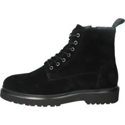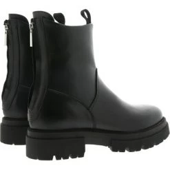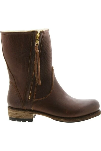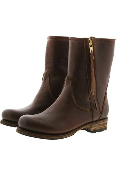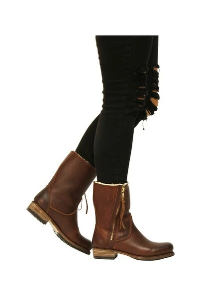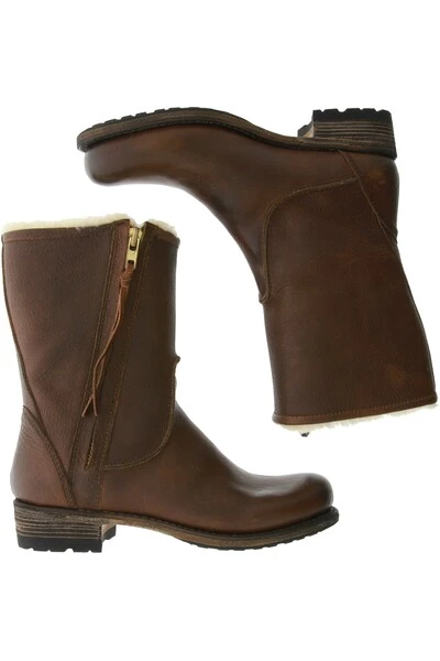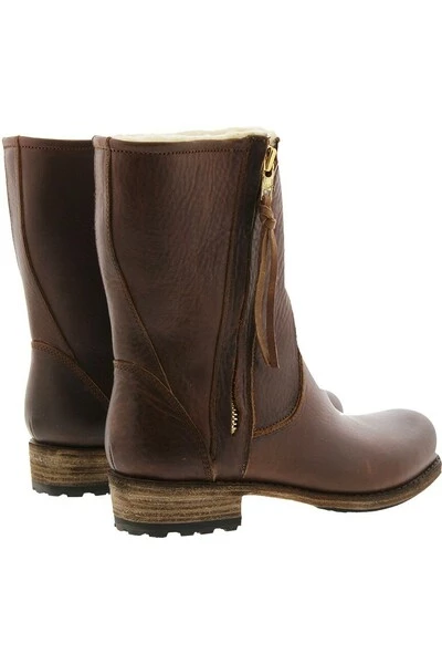 Winterlaarzen van stevig leer en gevoerd met schapenvacht. De laarzen hebben een diagonale, blinde rits aan de buitenkant en een gestikte zoolhak.